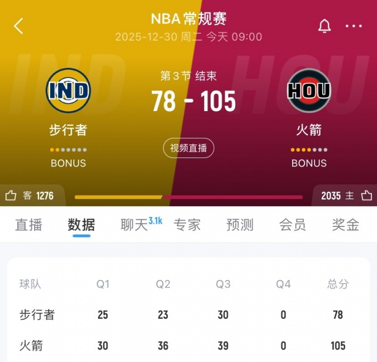 直播吧12月30日讯 NBA常规赛,火箭三节105-78领先步行者。